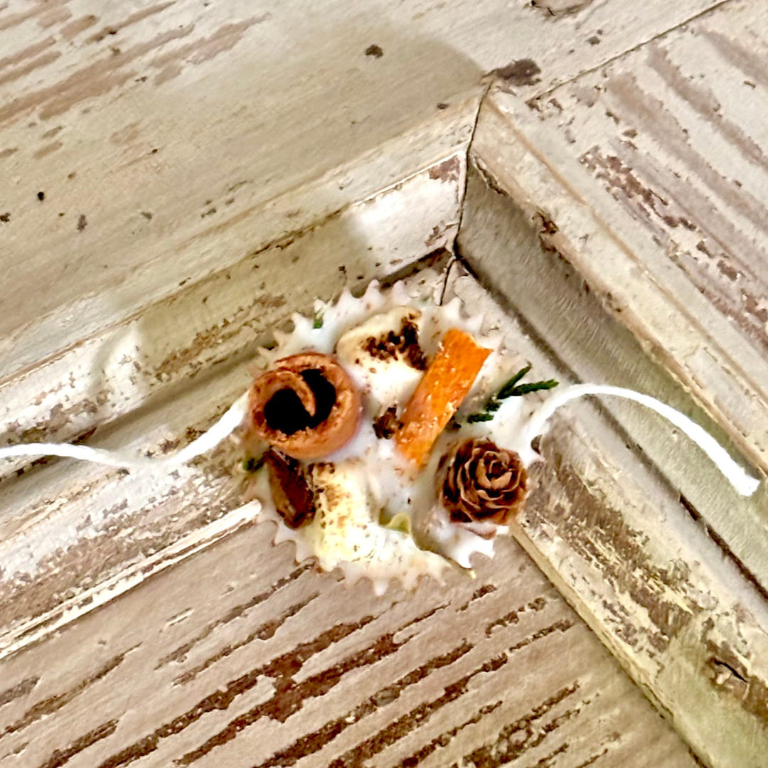 S'MORES: soy wax/ cotton wick/ cinnamon sticks/ baby pine cones/ evergreen/ star anise/ clove/ painted white polka dot stick/ bay leaf / signature scent