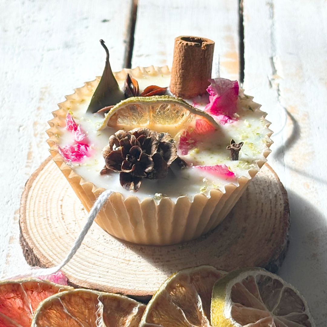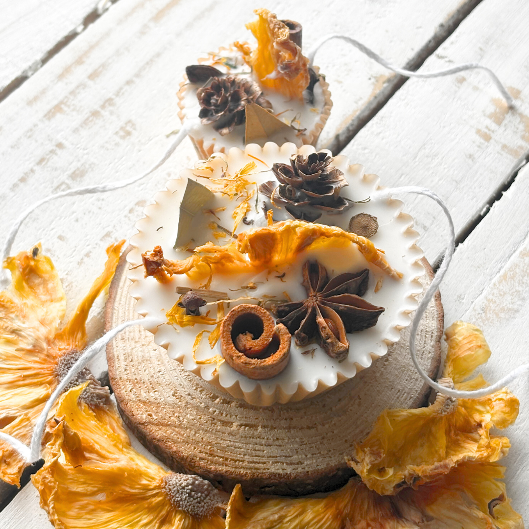 Scented with phthalate-free oils, fresh dried spices/herbs, dried fruit/flowers evergreen and other natural goodies, mostly hand collected on site and from local farms.